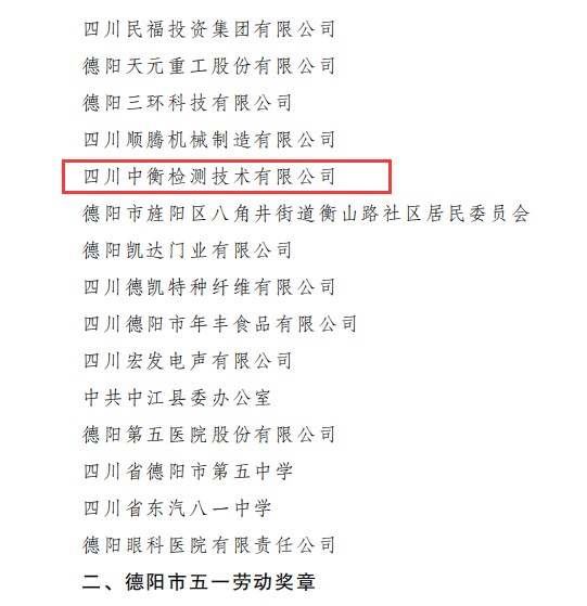在4月27日德陽市總工會文件中,四川中衡檢測技術有限公司在《關于表揚德陽市五一勞動獎和命名工人先鋒號的通報》里,受到了“德陽市五一勞動獎狀”的表彰。