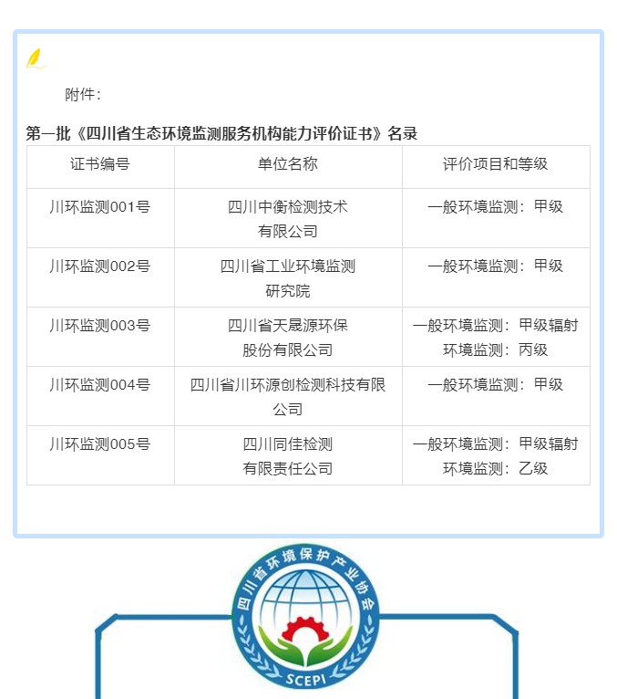 2月25日,四川省環(huán)境保護(hù)產(chǎn)業(yè)協(xié)會(huì)發(fā)布了首批《四川省生態(tài)環(huán)境監(jiān)測(cè)服務(wù)機(jī)構(gòu)能力評(píng)價(jià)證書(shū)》名錄。