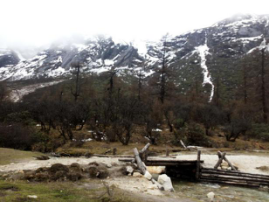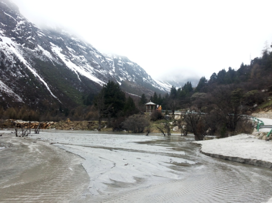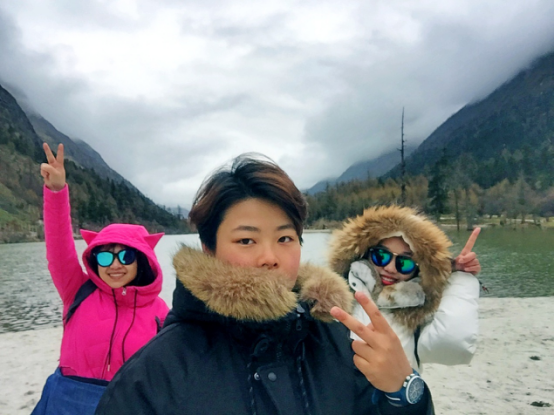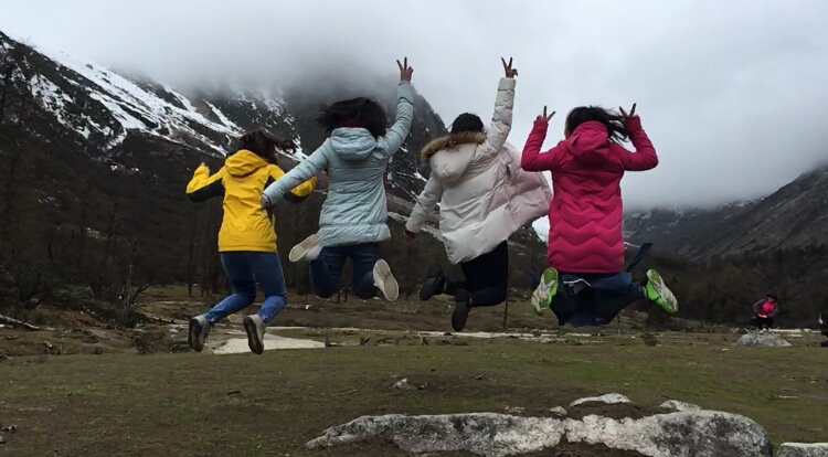 從景區(qū)門口到第一個(gè)景點(diǎn)相距20多公里,共33個(gè)急彎道,乘坐觀光大巴上去,司機(jī)大叔的車技了得,被我們戲稱為“秋名山車神”。可是盡管“車神”車技了得,那33道急彎的威力依然不容小覷,毫無懸念的,我們的小伙伴部分暈車了。所幸,不嚴(yán)重。下車,到達(dá)景區(qū),看到大雪山的那一刻便激動(dòng)了,于是開啟了我們拍拍拍的模式,一路走一路拍,上山的路上飄著小雪。