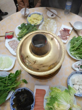 5點(diǎn)下山,回到酒店,開始晚餐:特色臧家火鍋。火鍋的味道還是很不錯(cuò)的,主題以素菜為主肉食為輔,廚師刀工特別好,肉薄似紗,私人訂制一人一片。
