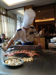 都說“舌尖上的幸福來自于美食的滋養(yǎng)”。今天的午餐,是我們這群吃貨的盛宴,豐盛的美食簡直讓人垂涎欲滴。海鮮的鮮美,肉類的焦香,聽著油脂滋滋作響的聲音,看著廚師嫻熟的燒烤手藝,吃著美味的烤肉,大家都興奮的回憶著小時候約著一群小伙伴在田野里燒烤的場景,雖然食物烤的焦黑了,但在當(dāng)時,還是覺得非常美味。美食總會令人感到幸福,在幸福感爆棚的氛圍中,大家一聊就停不下來,最后想到要看廚師表演“焰火冰淇淋”的時候,服務(wù)員很遺憾的告知我們廚師已經(jīng)下班很久了。
