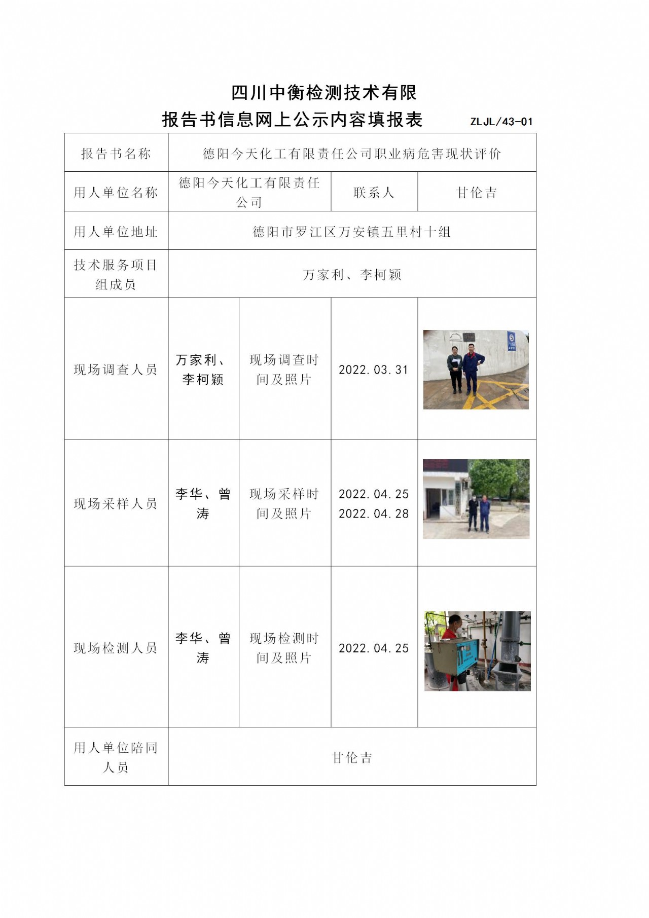 德陽今天化工有限責(zé)任公司職業(yè)病危害現(xiàn)狀評價
