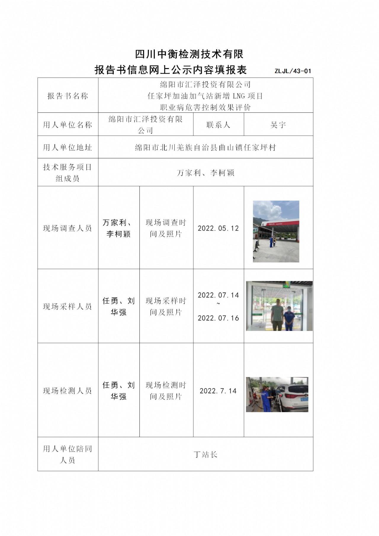 綿陽市匯澤投資有限公司 任家坪加油加氣站新增LNG項目 職業(yè)病危害控制效果評價