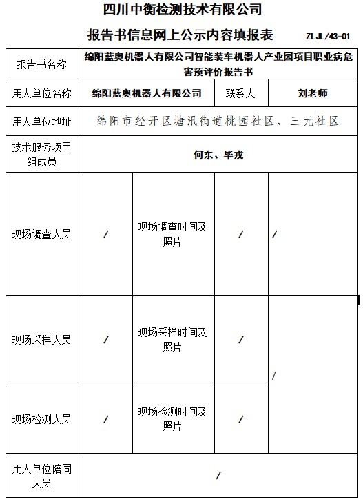 綿陽藍(lán)奧機(jī)器人有限公司智能裝車機(jī)器人產(chǎn)業(yè)園項目職業(yè)病危害預(yù)評價