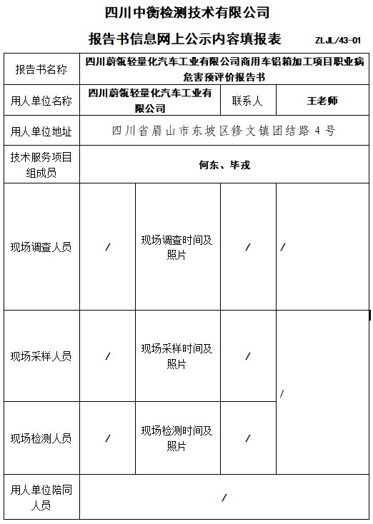 四川蔚瓴輕量化汽車工業(yè)有限公司商用車鋁箱加工項目職業(yè)病危害預評價