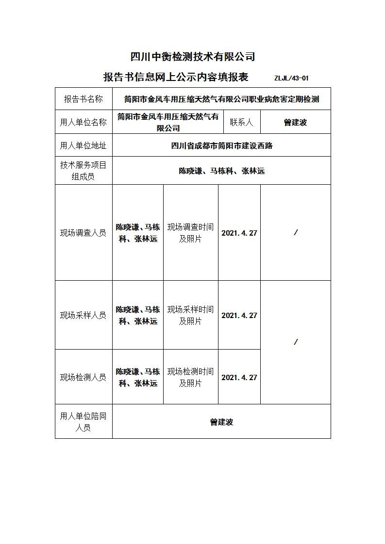 簡(jiǎn)陽(yáng)市金風(fēng)車(chē)用壓縮天然氣有限公司職業(yè)病危害定期檢測(cè)