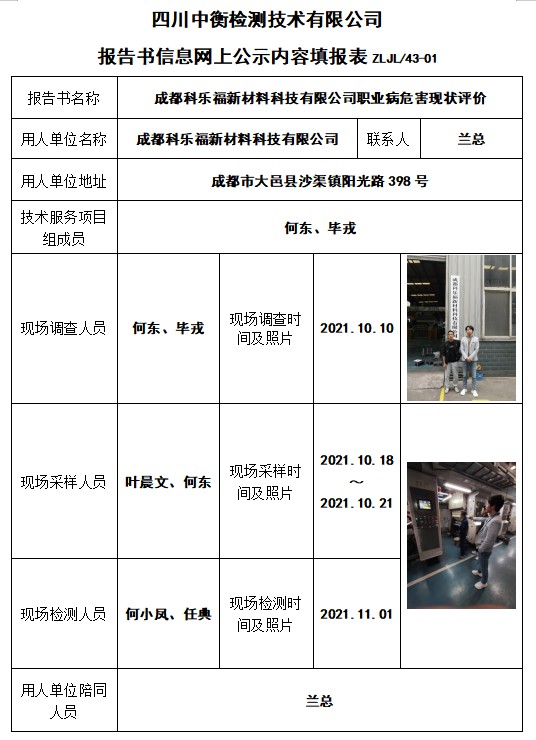 成都科樂福新材料科技有限公司職業(yè)病危害現(xiàn)狀評價