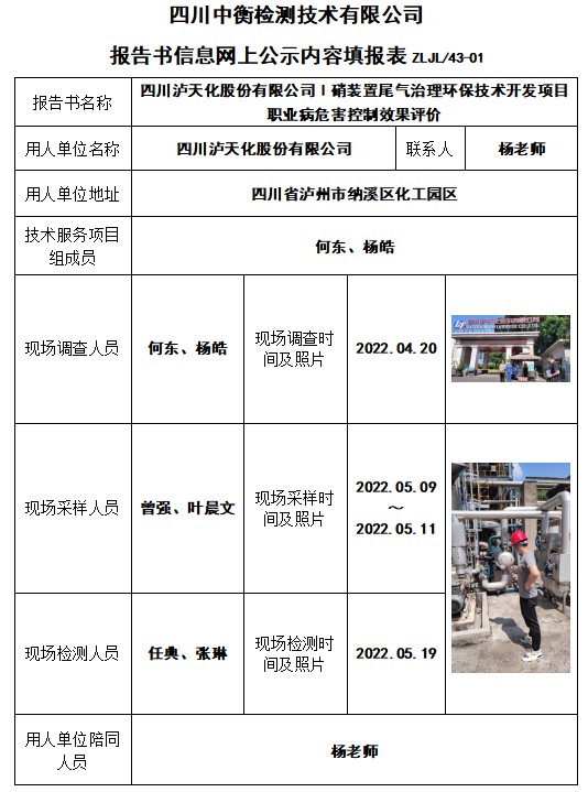 四川瀘天化股份有限公司Ⅰ硝裝置尾氣治理環(huán)保技術(shù)開(kāi)發(fā)項(xiàng)目職業(yè)病危害控制效果評(píng)價(jià)