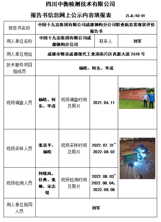 中國十九冶集團有限公司成都鋼構分公司職業(yè)病危害現狀評價