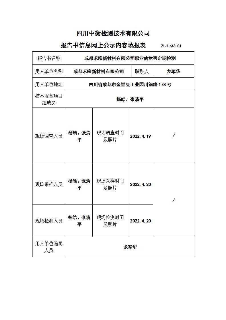 成都禾隆新材料有限公司職業(yè)病危害定期檢測