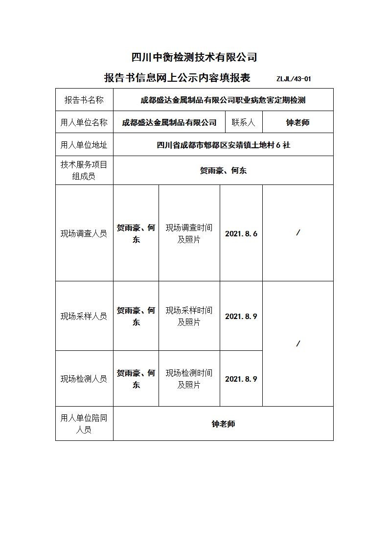 成都盛達(dá)金屬制品有限公司職業(yè)病危害定期檢測