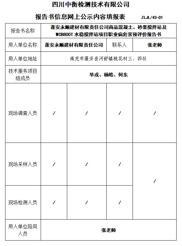 蓬安永順建材有限責(zé)任公司商品混凝土、砂漿攪拌站及WCB800T水穩(wěn)攪拌站項(xiàng)目職業(yè)病危害預(yù)評(píng)價(jià)