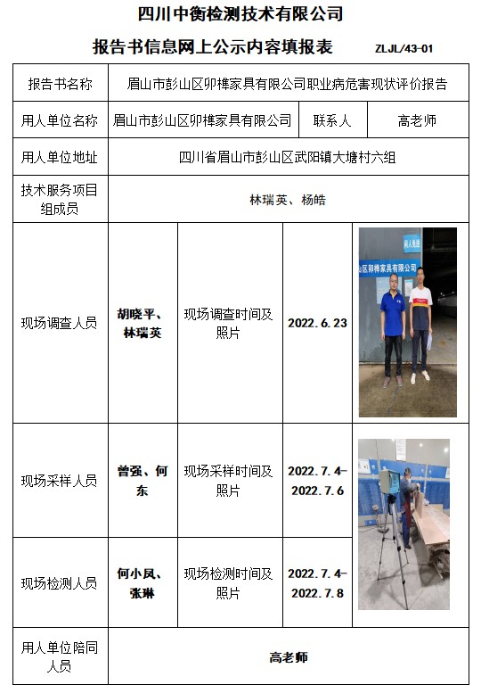 眉山市彭山區(qū)卯榫家具有限公司職業(yè)病危害現(xiàn)狀評(píng)價(jià)