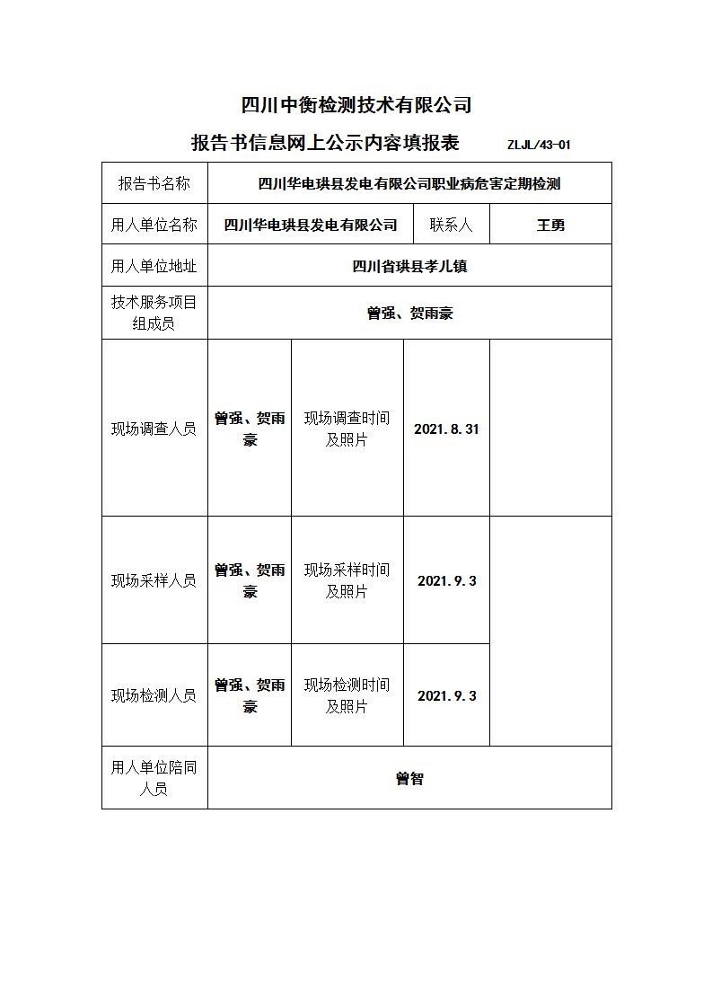 四川華電珙縣發(fā)電有限公司職業(yè)病危害定期檢測(cè)