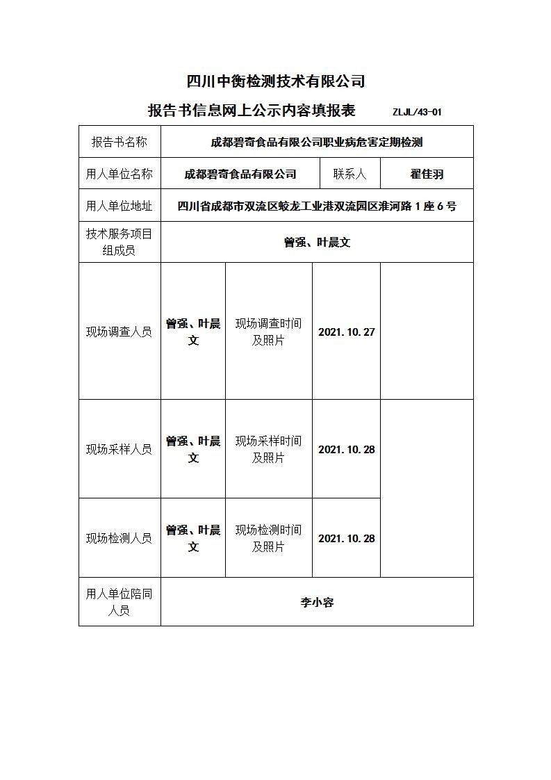 成都碧奇食品有限公司職業(yè)病危害定期檢測