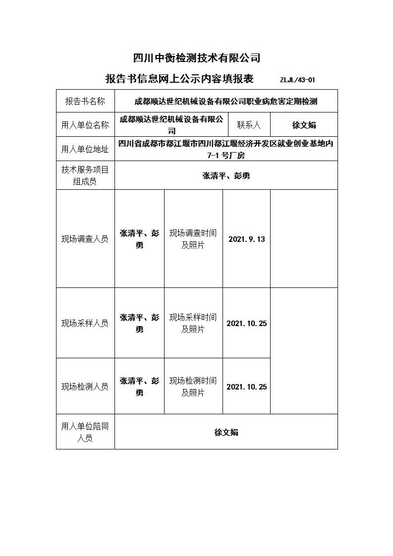 成都順達世紀機械設備有限公司職業(yè)病危害定期檢測
