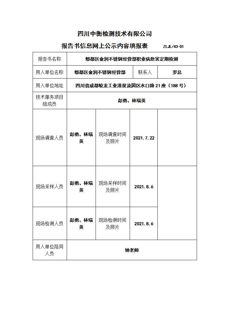 郫都區(qū)金潤(rùn)不銹鋼經(jīng)營(yíng)部職業(yè)病危害定期檢測(cè)