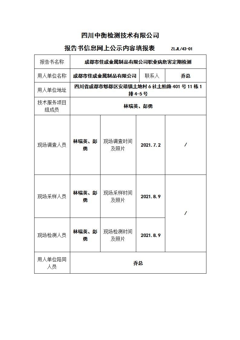 成都市佳成金屬制品有限公司職業(yè)病危害定期檢測(cè)