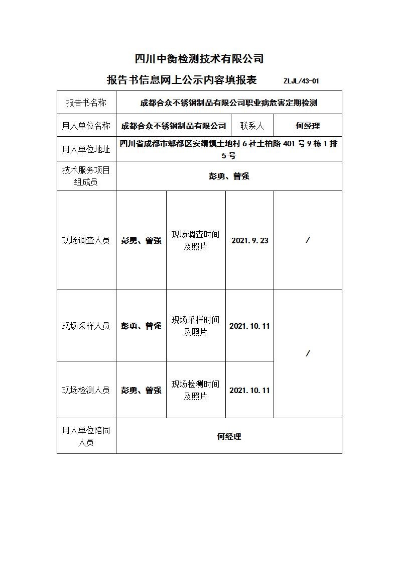 成都合眾不銹鋼制品有限公司職業(yè)病危害定期檢測