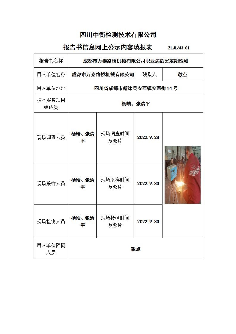 成都市萬泰路橋機(jī)械有限公司職業(yè)病危害定期檢測