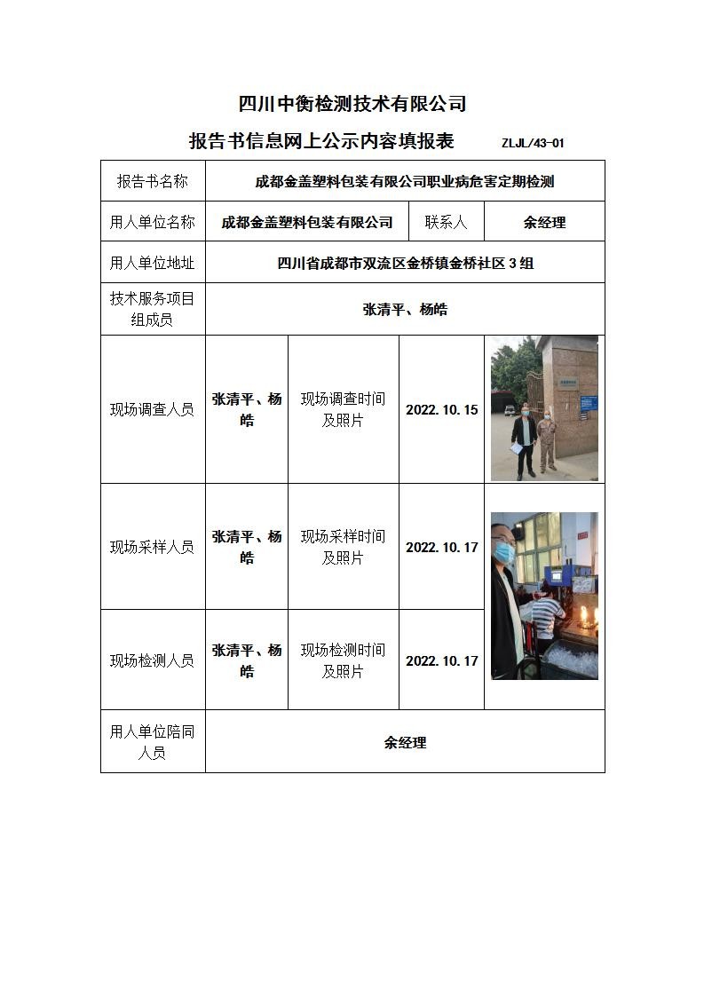 成都金蓋塑料包裝有限公司職業(yè)病危害定期檢測
