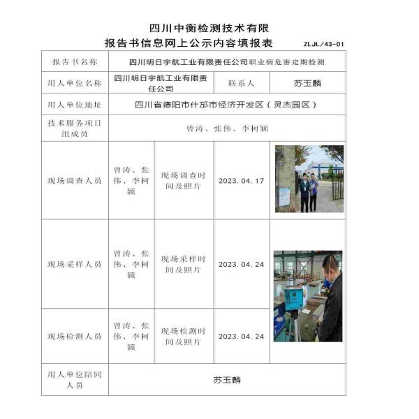 四川明日宇航工業(yè)有限責任公司職業(yè)病危害定期檢測