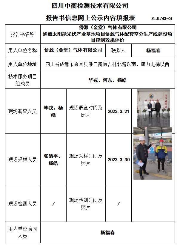 僑源(金堂)氣體有限公司 通威太陽能光伏產(chǎn)業(yè)基地項(xiàng)目僑源氣體配套空分生產(chǎn)線建設(shè)項(xiàng)目控制效果評價(jià)