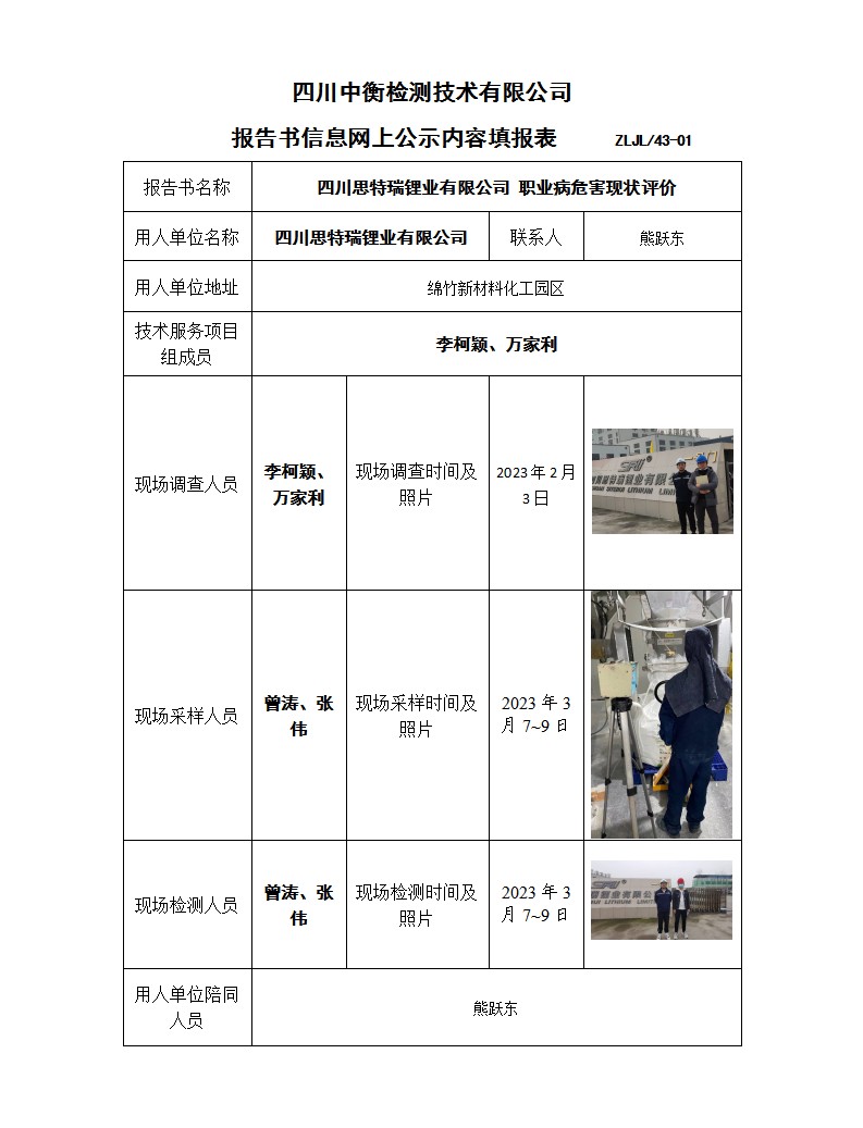 四川思特瑞鋰業(yè)有限公司 職業(yè)病危害現(xiàn)狀評(píng)價(jià)報(bào)告書