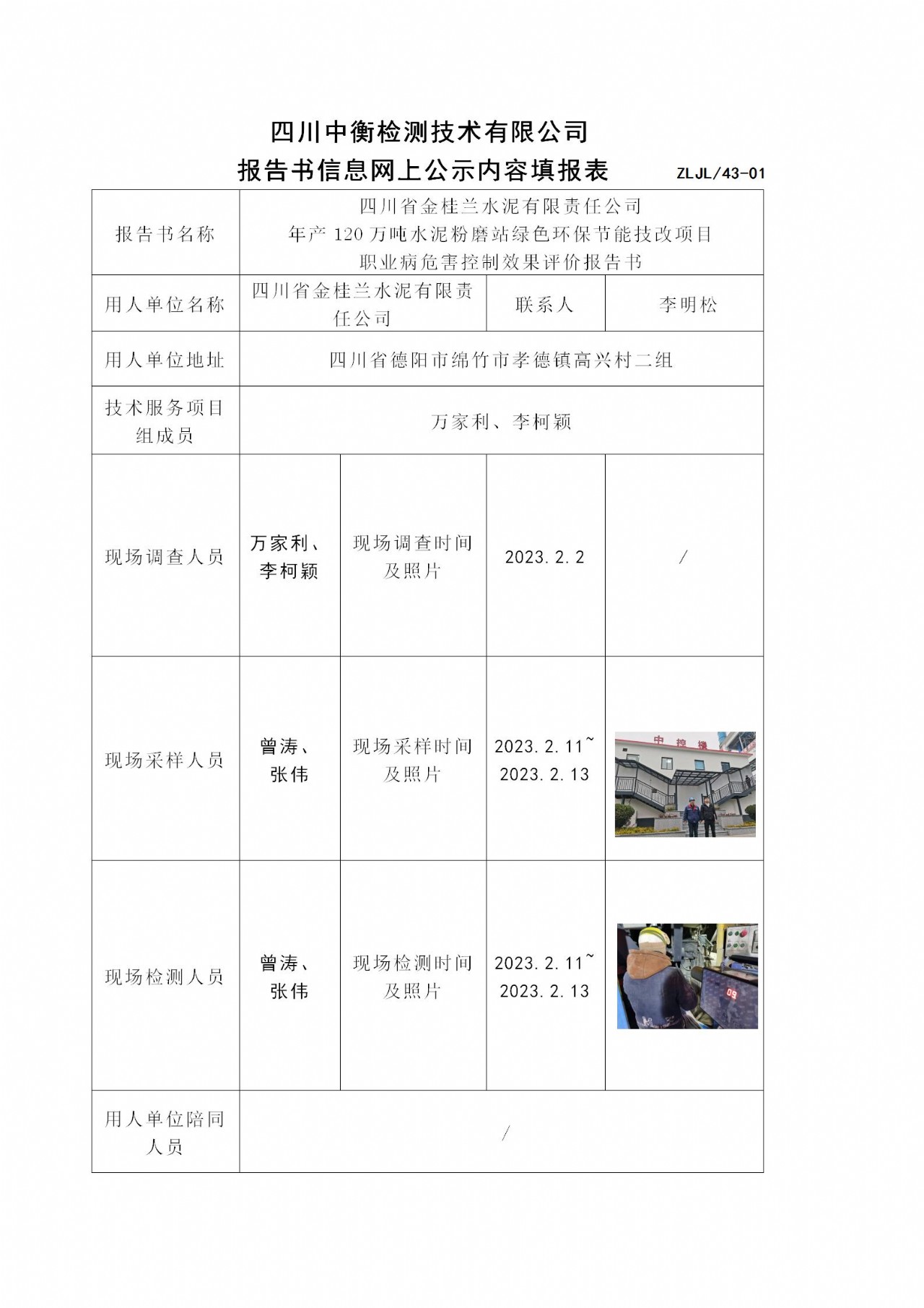 四川省金桂蘭水泥有限責任公司 年產(chǎn)120萬噸水泥粉磨站綠色環(huán)保節(jié)能技改項目 職業(yè)病危害控制效果評價