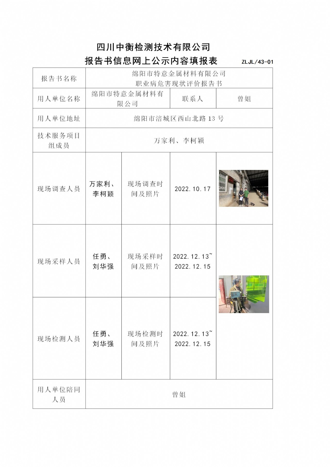 綿陽(yáng)市特意金屬材料有限公司 職業(yè)病危害現(xiàn)狀評(píng)價(jià)
