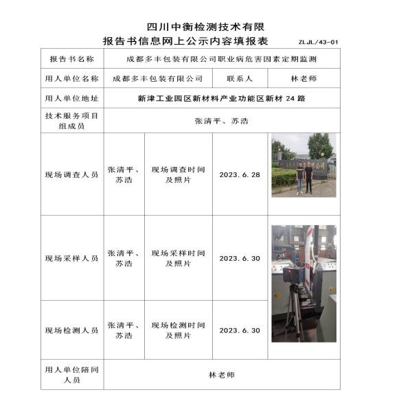 成都多豐包裝有限公司定期檢測