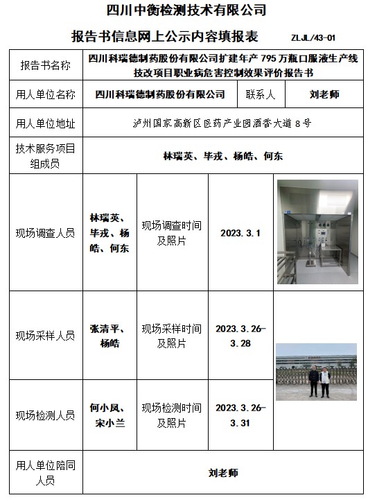 四川科瑞德制藥股份有限公司擴建年產(chǎn)795萬瓶口服液生產(chǎn)線技改項目職業(yè)病危害控制效果評價報告書