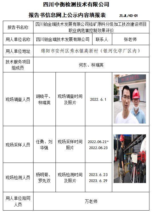 四川鉑金瑞技術(shù)發(fā)展有限公司鉻礦原料分級加工技改建設(shè)項目 職業(yè)病危害控制效果評價