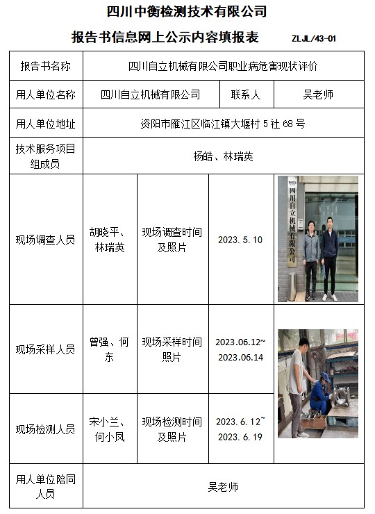 四川自立機(jī)械有限公司職業(yè)病危害現(xiàn)狀評價(jià)