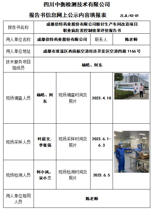 成都倍特藥業(yè)股份有限公司粉針生產(chǎn)車間改造項(xiàng)目 職業(yè)病危害控制效果評(píng)價(jià)報(bào)告書