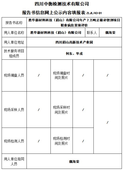勝華新材料科技(眉山)有限公司年產(chǎn)2萬噸正極補(bǔ)鋰劑項(xiàng)目職業(yè)病危害預(yù)評(píng)價(jià)