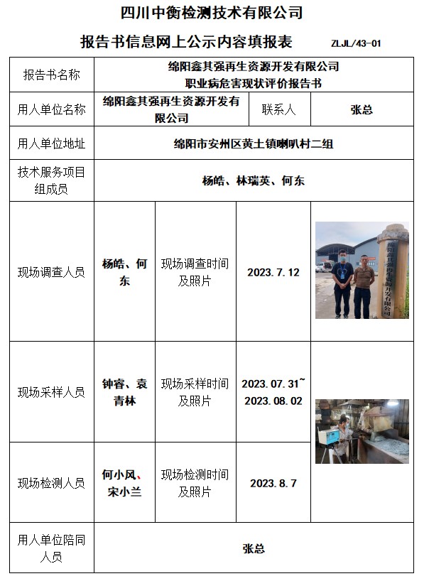 綿陽鑫其強再生資源開發(fā)有限公司 職業(yè)病危害現(xiàn)狀評價報告書