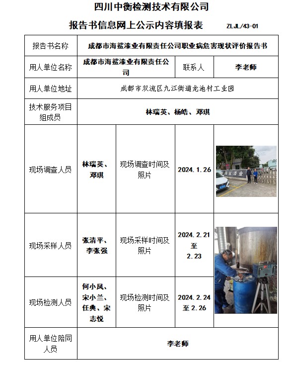 成都市海鯊漆業(yè)有限責(zé)任公司職業(yè)病危害現(xiàn)狀評價(jià)報(bào)告書