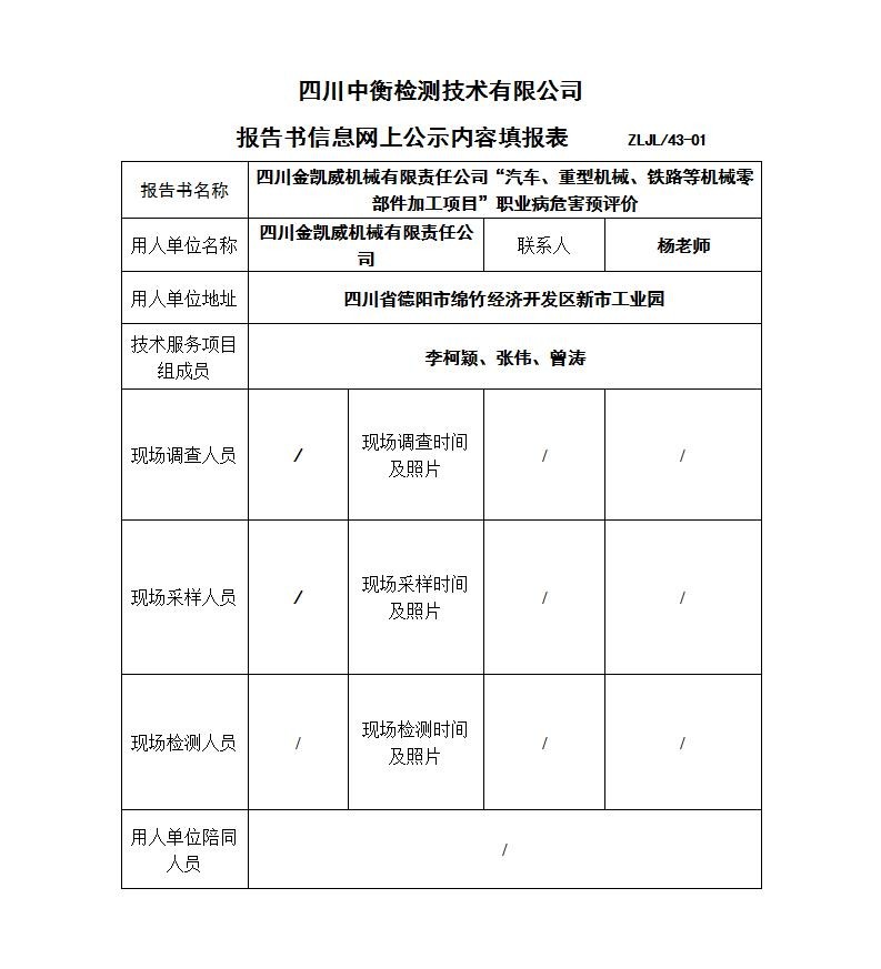 四川金凱威機(jī)械有限責(zé)任公司“汽車、重型機(jī)械、鐵路等機(jī)械零部件加工項目”職業(yè)病危害預(yù)評價