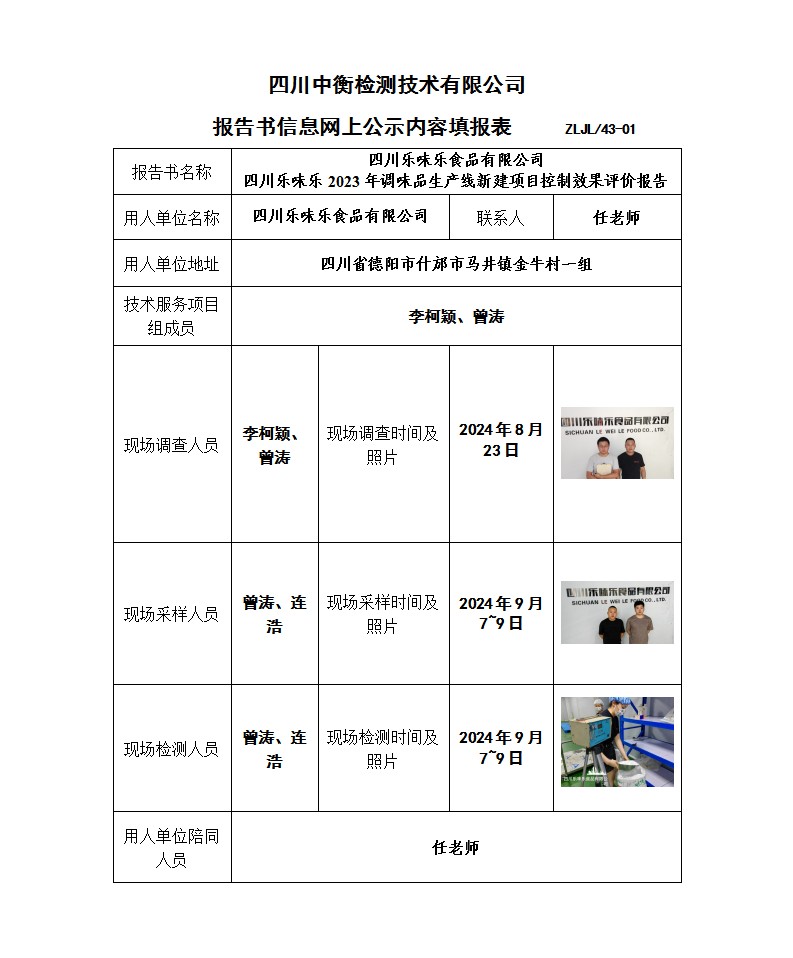 四川樂味樂食品有限公司 四川樂味樂2023年調(diào)味品生產(chǎn)線新建項目 職業(yè)病危害控制效果評價報告書