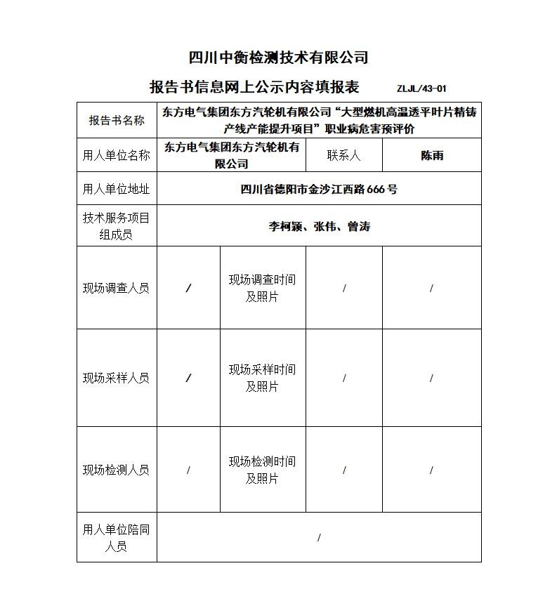 東方電氣集團東方汽輪機有限公司“大型燃機高溫透平葉片精鑄產(chǎn)線產(chǎn)能提升項目”職業(yè)病危害預(yù)評價