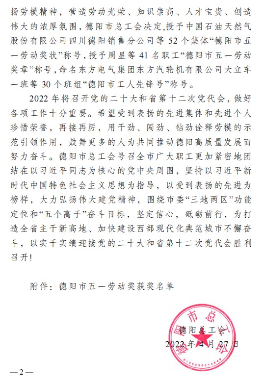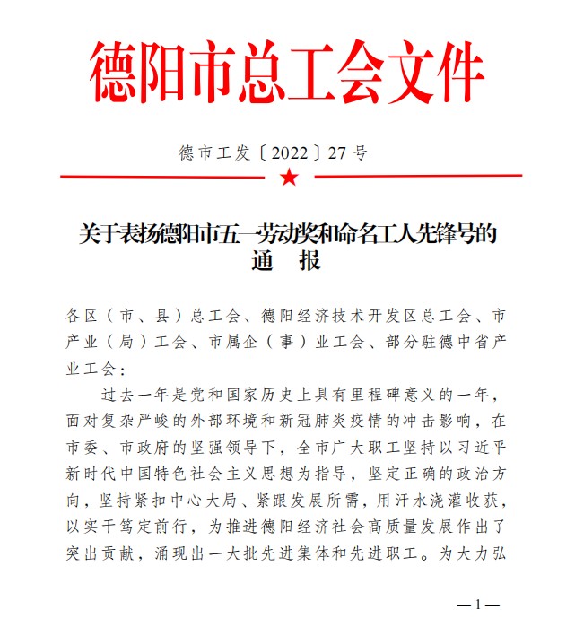 在4月27日德陽市總工會文件中,四川中衡檢測技術有限公司在《關于表揚德陽市五一勞動獎和命名工人先鋒號的通報》里,受到了“德陽市五一勞動獎狀”的表彰。