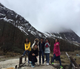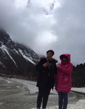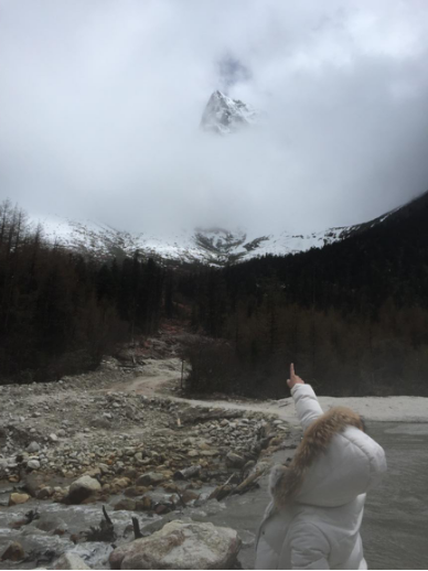 從景區(qū)門口到第一個(gè)景點(diǎn)相距20多公里,共33個(gè)急彎道,乘坐觀光大巴上去,司機(jī)大叔的車技了得,被我們戲稱為“秋名山車神”。可是盡管“車神”車技了得,那33道急彎的威力依然不容小覷,毫無懸念的,我們的小伙伴部分暈車了。所幸,不嚴(yán)重。下車,到達(dá)景區(qū),看到大雪山的那一刻便激動(dòng)了,于是開啟了我們拍拍拍的模式,一路走一路拍,上山的路上飄著小雪。