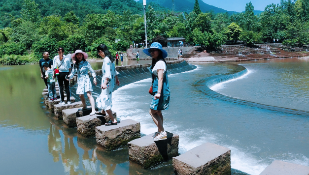 踩著間隙不一的石頭一路前行,溪水從上至下流進河里,瞬間有種脫鞋赤腳玩水的沖動。真是應(yīng)了那句廣告詞“透心涼,心飛揚啊。”