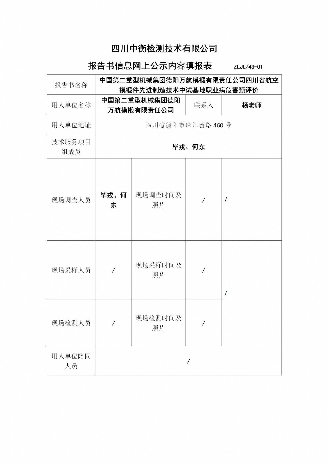 中國第二重型機(jī)械集團(tuán)德陽萬航模鍛有限責(zé)任公司四川省航空模鍛件先進(jìn)制造技術(shù)中試基地職業(yè)病危害預(yù)評(píng)價(jià)