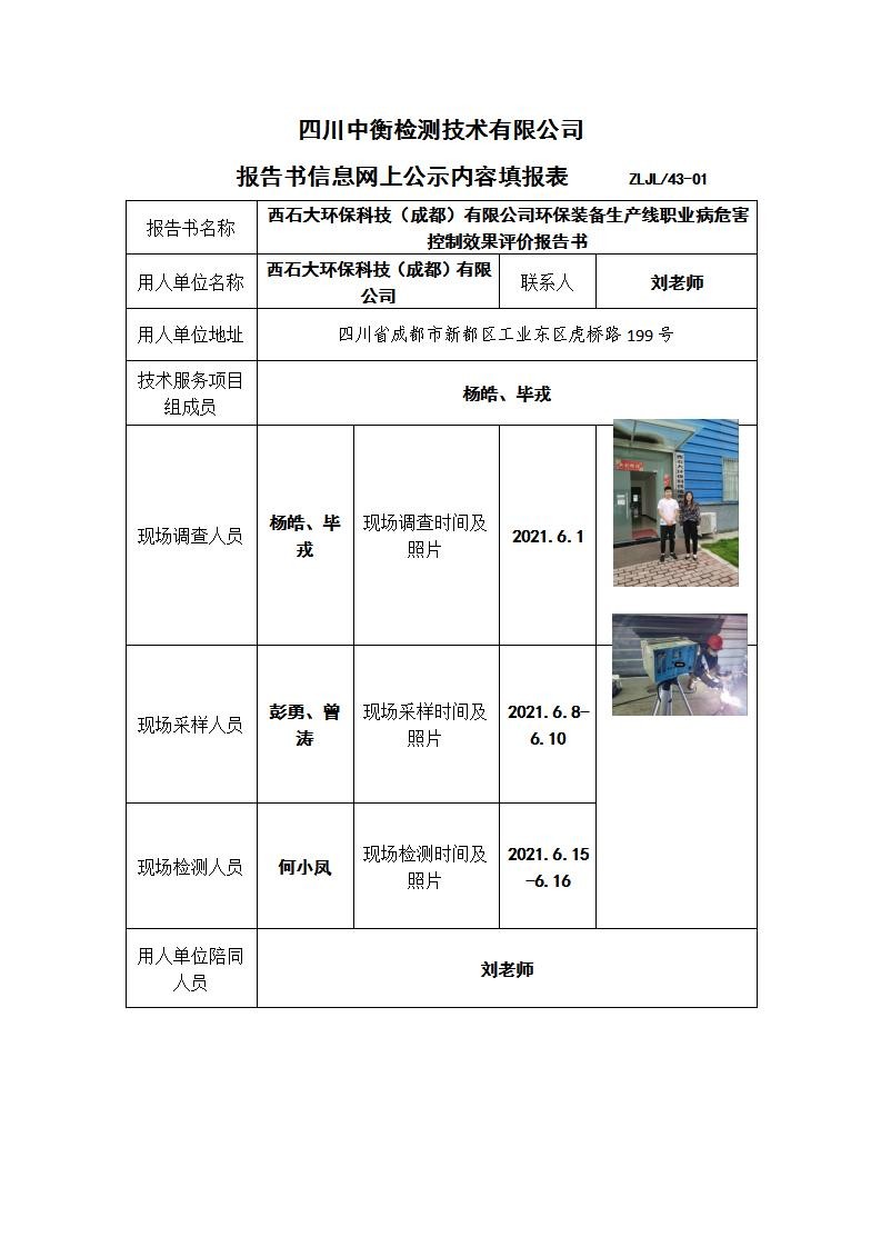 西石大環(huán)保科技(成都)有限公司環(huán)保裝備生產(chǎn)線職業(yè)病危害控制效果評價報告書