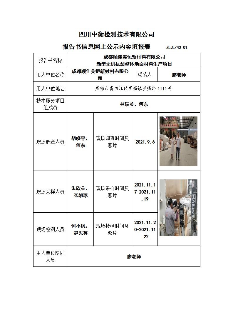 成都順佳美恒新材料有限公司 新型無機抗裂整體地面材料生產(chǎn)項目