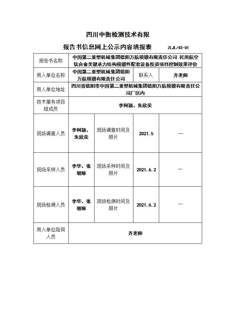 中國第二重型機械集團德陽萬航模鍛有限責(zé)任公司 民用航空鈦合金關(guān)鍵承力結(jié)構(gòu)模鍛件配套設(shè)備投資項目控制效果評價