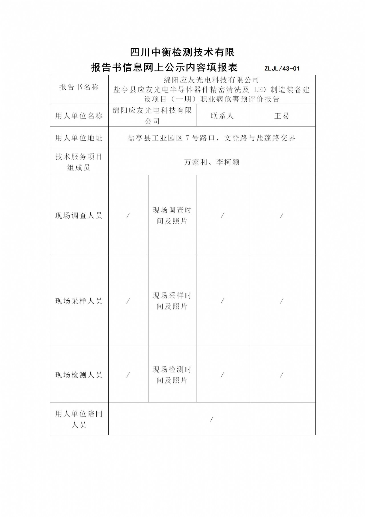 綿陽應(yīng)友光電科技有限公司 鹽亭縣應(yīng)友光電半導(dǎo)體器件精密清洗及 LED 制造裝備建設(shè)項(xiàng)目(一期)職業(yè)病危害預(yù)評價(jià)