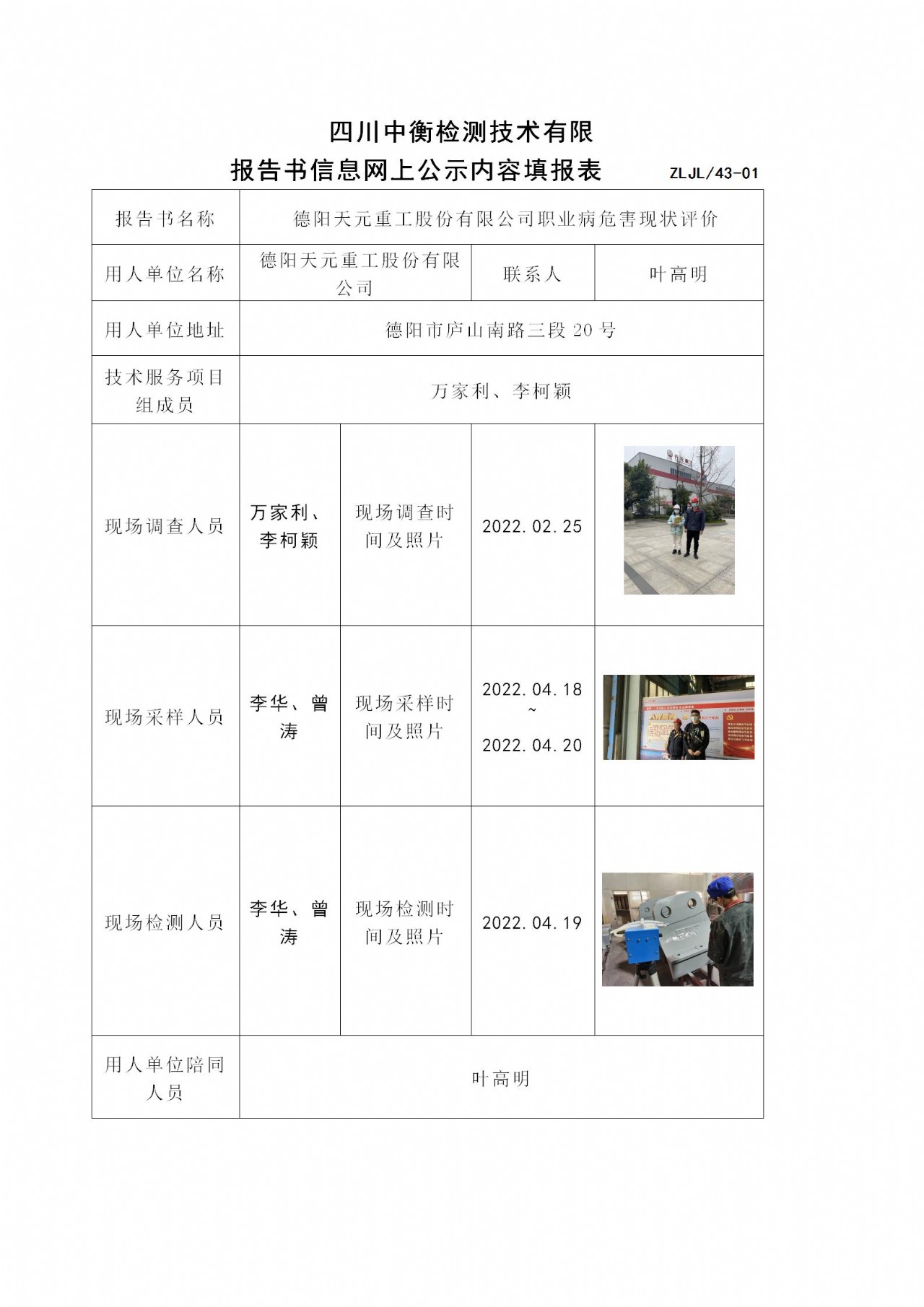 德陽天元重工股份有限公司職業(yè)病危害現(xiàn)狀評價(jià)